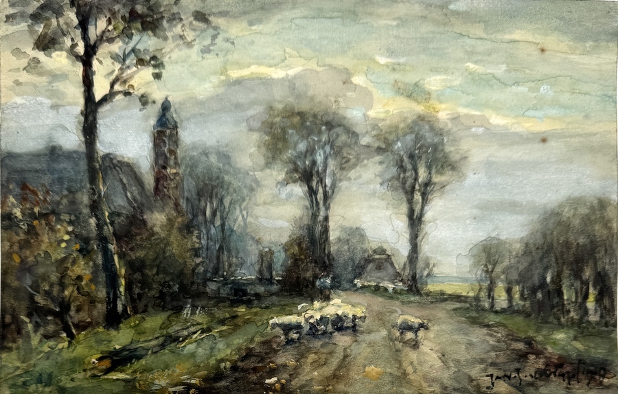 Aquarel van de Nederlandse schilder Johannes Jacobus Van Der Stap (1874–1940) uit 1917. Het landschap, uitgevoerd in de stijl van de Haagse School, toont een landweg, herder met schapen, hoge bomenrij, kerktoren links en boerderij in de verte onder bewolkte lucht. Het werk is geschilderd in waterverf op papier, met een sober kleurenpalet. Het is rechtsonder gesigneerd met "Jan J. v.d. Stap" en gedateerd 1917.