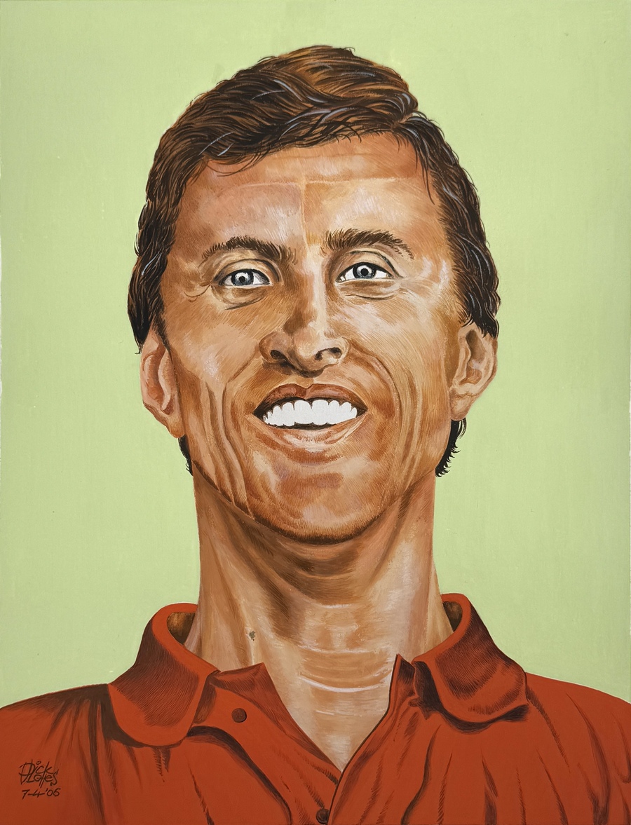 Gouche op papier in illustratieve realistisch-figuratieve stijl door Dick Vlottes (1932-2022), linksonder gesigneerd en gedateerd 7-4-2006. Frontaal busteportret van Johan Cruyff tegen egaal lichtgroene achtergrond; rood poloshirt met open kraag, sterke licht-donker modellering en strakke vlakverdeling. Gebruikt als illustratie voor "Johan Cruyff geeft voetballes". Signatuur en datering in zwart.