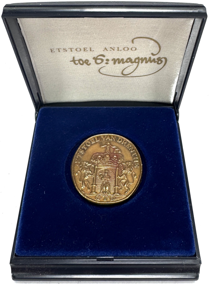 Deze penning is een replica van een lakzegel van de historische Etstoel Anloo, zoals dat tussen 1802 en 1811 werd gebruikt. Het object is vervaardigd van brons en is gegoten met een wapen in reliëf, geflankeerd door twee leeuwen. De penning wordt gepresenteerd in een zwart etui met een blauw fluwelen interieur, met de tekst “ETSTOEL ANLOO” op de binnenzijde. Het origineel bevindt zich in het Provinciaal Museum van Drenthe.