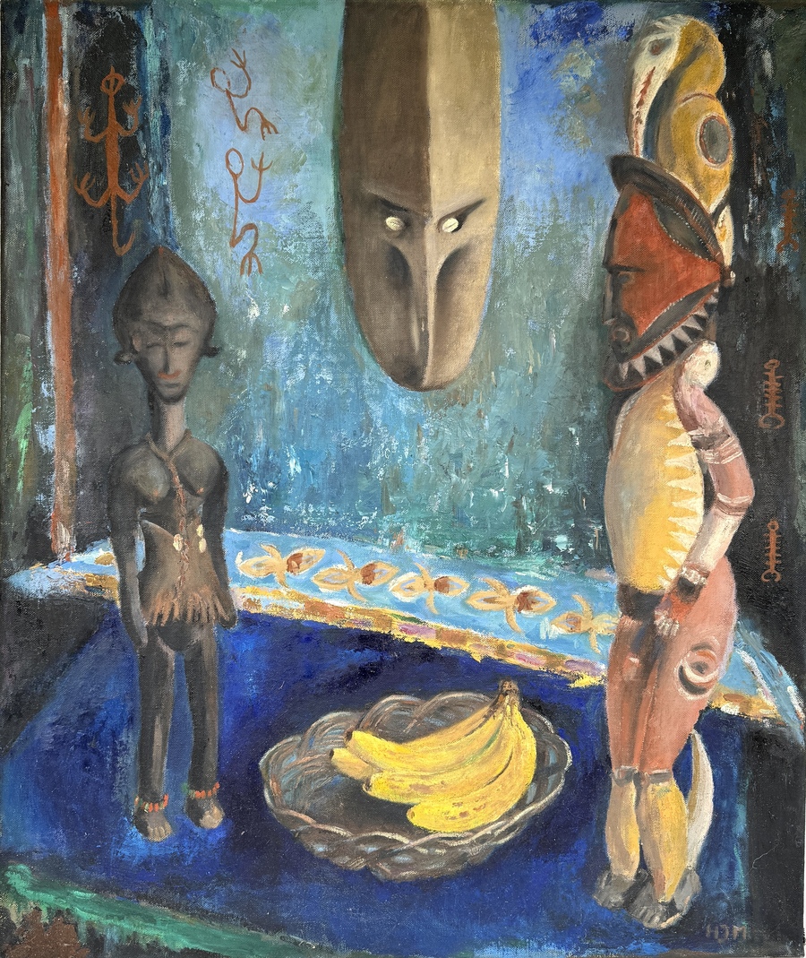 Schilderij in modernistische stijl, midden 20e eeuw, rechtsonder gesigneerd “HJM”, uitgevoerd in olieverf op doek. Voorstelling met twee Afrikaanse figuren, een masker en een schaal bananen tegen een blauwgroene achtergrond met decoratieve patronen. Expressieve penseelstreken en contrasterende kleurvlakken.