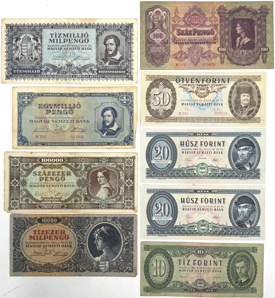 Set van negen Hongaarse bankbiljetten, uitgegeven door de Magyar Nemzeti Bank, daterend 1945–1960. Uitgevoerd in bedrukt katoenvezel-bankpapier met meerkleurige diepdruk en steendruk. Inclusief pengő- en forintwaarden: 10 miljoen milpengő, 1 miljoen pengő, 100.000 pengő, 10.000 milpengő, 100 pengő, 50 forint, 20 forint (2 varianten) en 10 forint. Voorzien van guillochemotieven, allegorische figuren, portretten en landschapsweergaven.