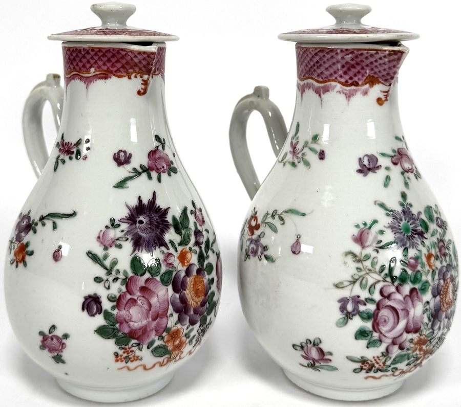 Chienlung porseleinen melkkannen, eind 18e eeuw. Geschilderd in Europa in rococo stijl met polychroom handbeschilderde bloemdecoraties in paarse, groene en oranje tinten, onder een rood gemarmerde band.