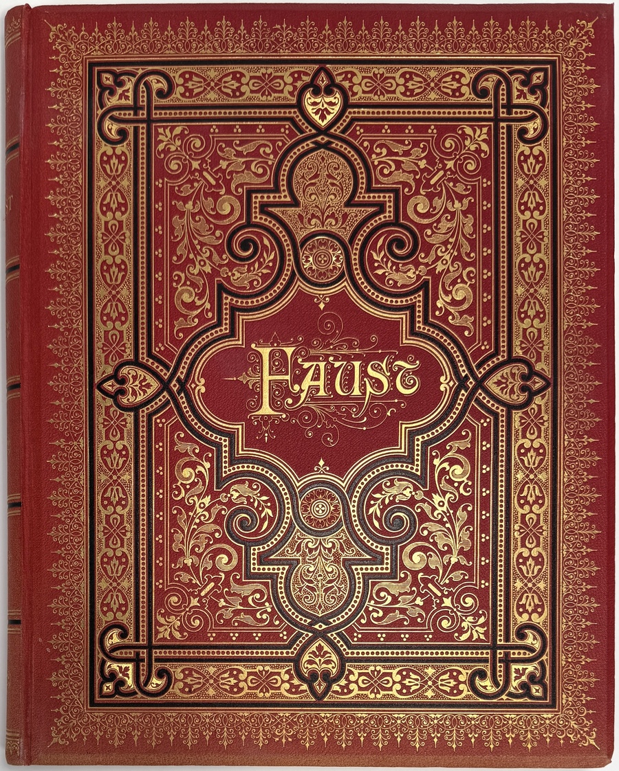 "Faust van Goethe", auteur Johann Wolfgang von Goethe (1749–1832), Nederlandse vertaling J.J.L. ten Kate (1819–1889). Uitgave A.W. Sijthoff, Leiden, eind 19e eeuw. Rode boekbinderslinnen band met goudstempel en goud-op-snee. Geïllustreerde titelpagina met sierinitiaal; Nederlands binnenwerk in gotische typografie; geornamenteerde schutbladen. Inwendige opmaak met tekst in twee kolommen en ingevoegde staalgravure plaat met Faust in studeervertrek.