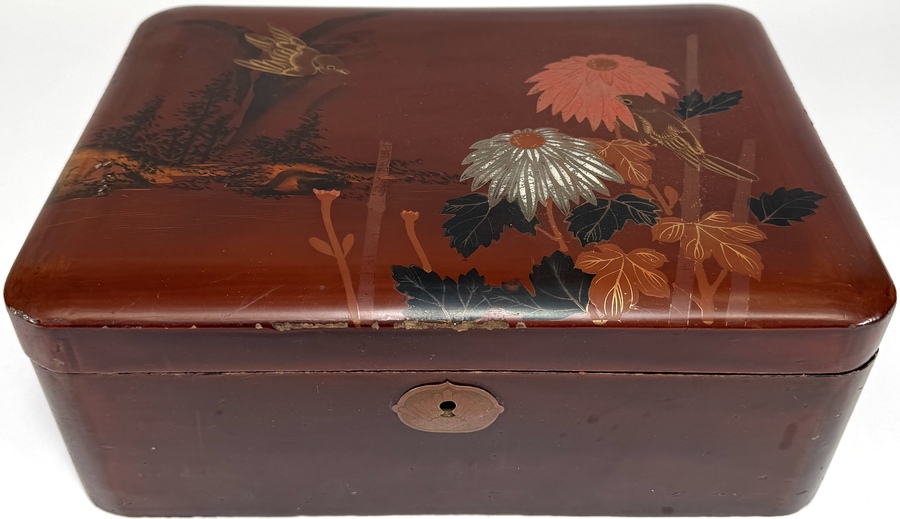 Japanse houten doosje, begin 20e eeuw, met roodbruine lak buitenzijde en zwarte lak binnenzijde. Techniek: maki-e met goudkleurig en zilverkleurig metaalpoeder. Deksel met chrysanten, bladeren en twee vogels voor landschappelijk fond, afgeronde hoeken en scharnierend deksel. Voorzijde met bladvormig slotplaatje.