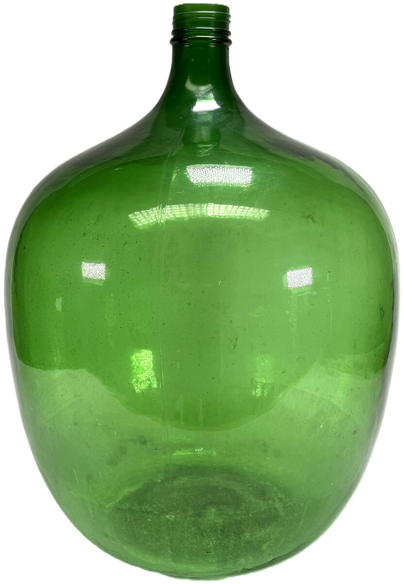 Grote glazen kruik, zogenaamde Dame Jeanne, van helder groen glas. De kruik is gemaakt door middel van glasblazen en machinale vormgeving en dateert uit de jaren '60. Het object heeft een bolvormig lichaam en een dunne, taps toelopende hals met schroefdraad.