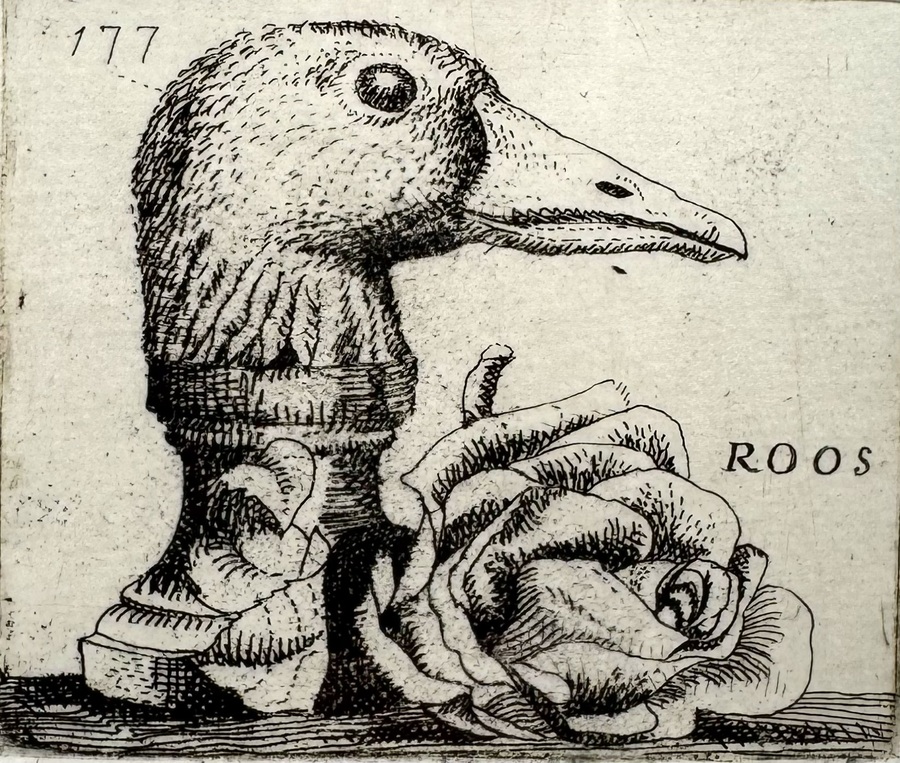 Ets van Hermanus Berserik (1921–2002), papier en inkt, surrealistische voorstelling van een eendekop op sokkel naast een roos. Gesigneerd Berserik met vermelding eigendruk en H.C. (hors commerce). Niet gedateerd, vermoedelijk jaren ’90. Uitgevoerd in zwarte inkt op papier, gemonteerd in aluminium wissellijst, met nummering 177 in de prent.