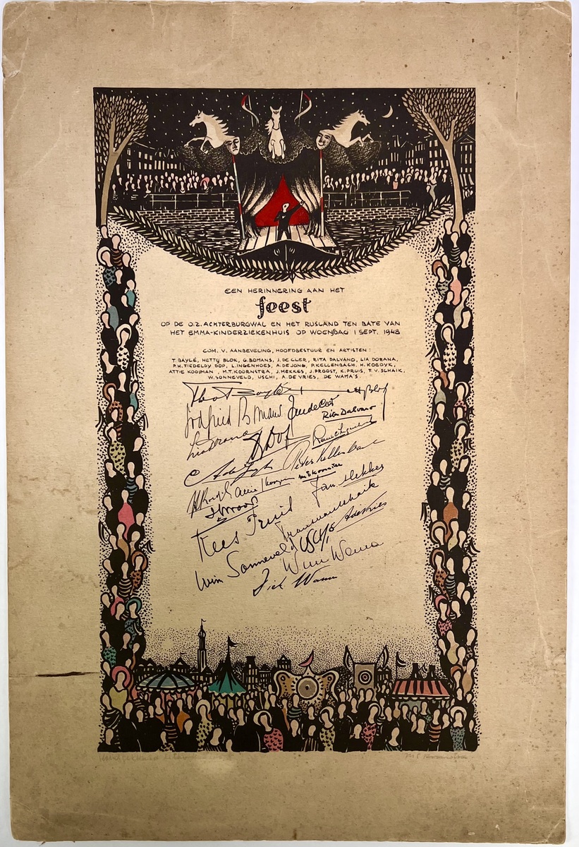 Kleurhoutsnede van Metten Koornstra (1912–1978), Nederland, 1948, papier en inkt, ontworpen als herinnering aan een benefietfeest voor het Emma-Kinderziekenhuis in Amsterdam. De prent toont een circusachtige voorstelling en is gesigneerd in potlood, met diverse handtekeningen van betrokken artiesten.