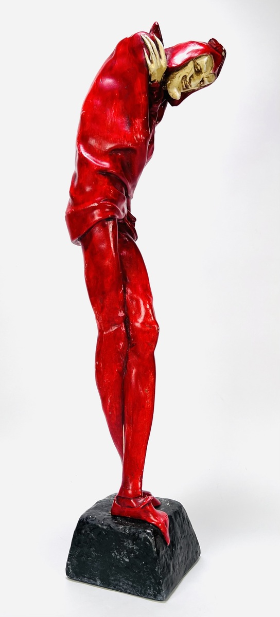 Gipsen beeld in expressieve stijl, 20e eeuw, gesneden en polychroom beschilderd. Voorstelling van Mephistopheles, rood gekleurde afwerking en contrasterende lichte accenten. Op zwarte sokkel en voorzien van laklaag.