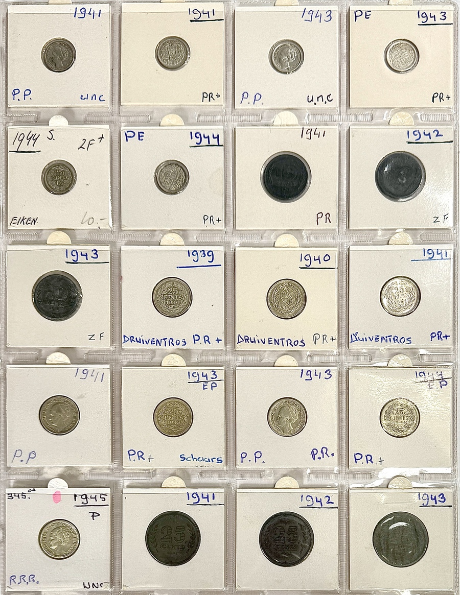 Twintig Koninkrijk der Nederlanden munten uit de jaren 1939 t/m 1945.