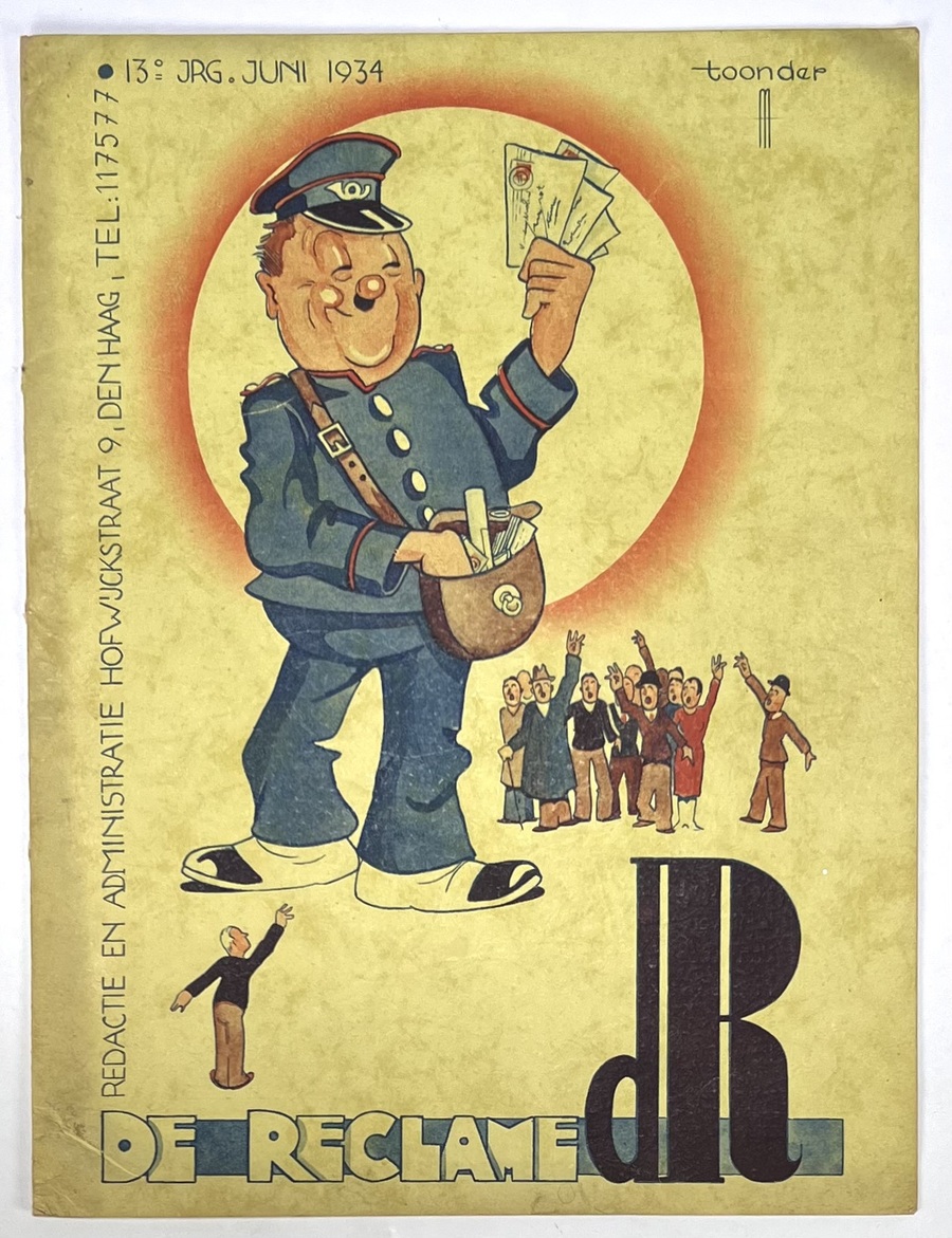 Origineel Nederlands reclameblad De Reclame, 13e jaargang, juni 1934, gedrukt op papier en ontworpen door Studio Toonder. Illustratief ontwerp in modernistische stijl met postbode, man in stoel en reclameboodschappen, typerend voor de commerciële grafiek uit de jaren dertig.