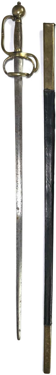 19e-eeuws Europees zwaard met ijzeren lemmet, messing gevest en houten handvat, voorzien van leren schede met messing beslag. Gegraveerde initialen “A.V.” op het gevest. Omstreeks 1850–1900.