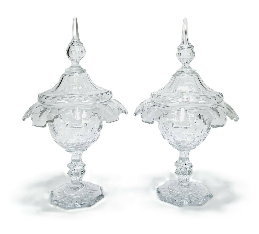 Paar kristallen dekselvazen, vermoedelijk Bohemen, tweede helft 19e eeuw. Helder loodkristal, handgeslepen met ovale decoraties en facetgeslepen voet en knop. Hoog, elegant model met uitgesneden sierrand.