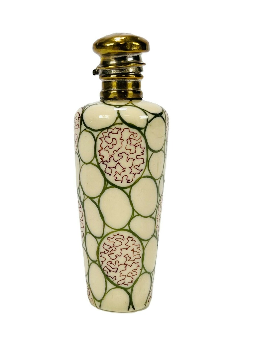 Porseleinen Art Nouveau geurflacon met messing scharnierdop, ca. 1900. Versierd met abstract decor in crèmekleur, zachtgroen en rood, typerend voor de vloeiende organische stijl van de periode. De dop is gegraveerd en kan opengeklapt worden.