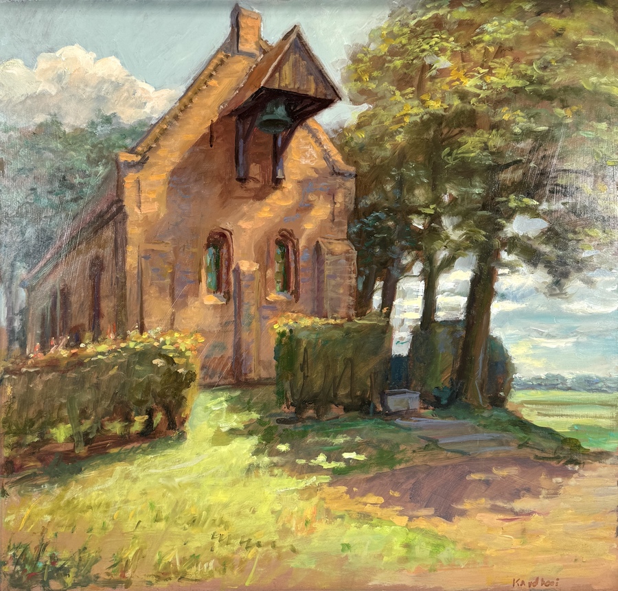 Olieverfschilderij op doek door Keimpe van der Kooi (1952), circa eind 20e eeuw. Kerkje van Janum in de zomer, impressionistisch geschilderd en gesigneerd rechtsonder. In opdracht geschilderd.