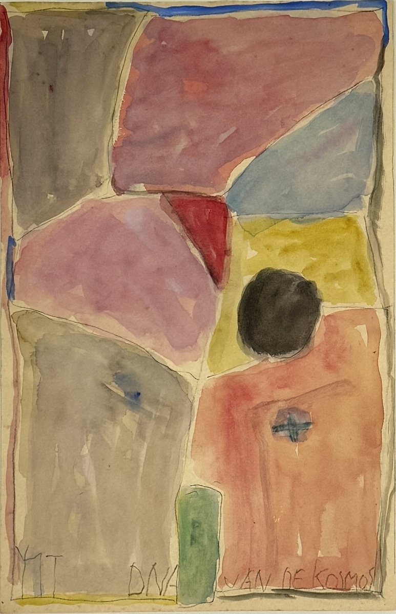 Aquarel en potloodtekening van Groningse kunstenaar Martin Tissing (1936–2023), datering 2010, getiteld "DNA van de kosmos". Uitgevoerd op lichtgeel papier, opgebouwd uit organische kleurvlakken in zachte tinten en contourlijnen. Linksonder gemonogrammeerd en rechtsonder getiteld. Verso vermelding titel, datum en techniek.