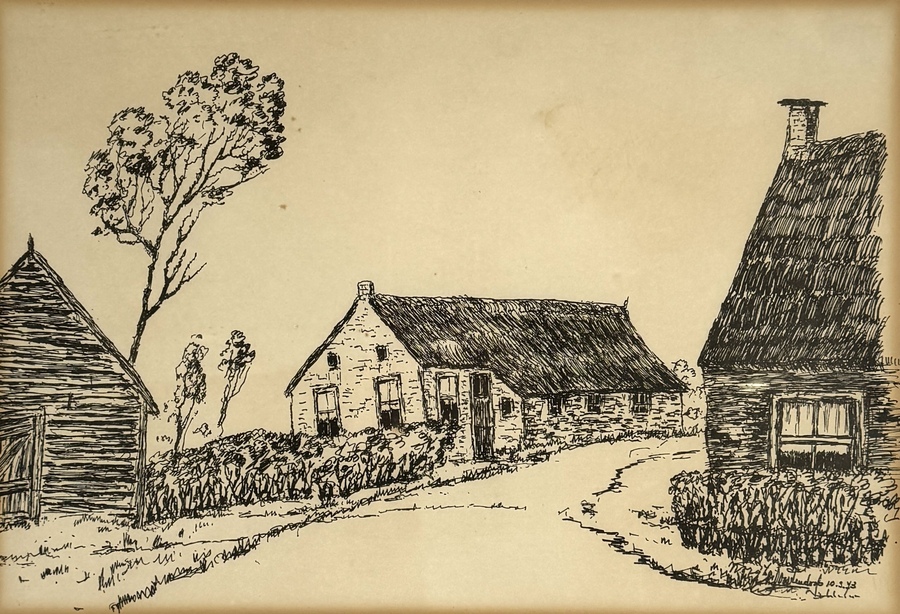 Pen en inkttekening op papier, datering 10-5-1973. De tekening toont een landelijk tafereel met traditionele architectuur en windgebogen bomen, uitgevoerd in gedetailleerde zwart-wit lijnen. Onduidelijk gesigneerd rechtsonder.