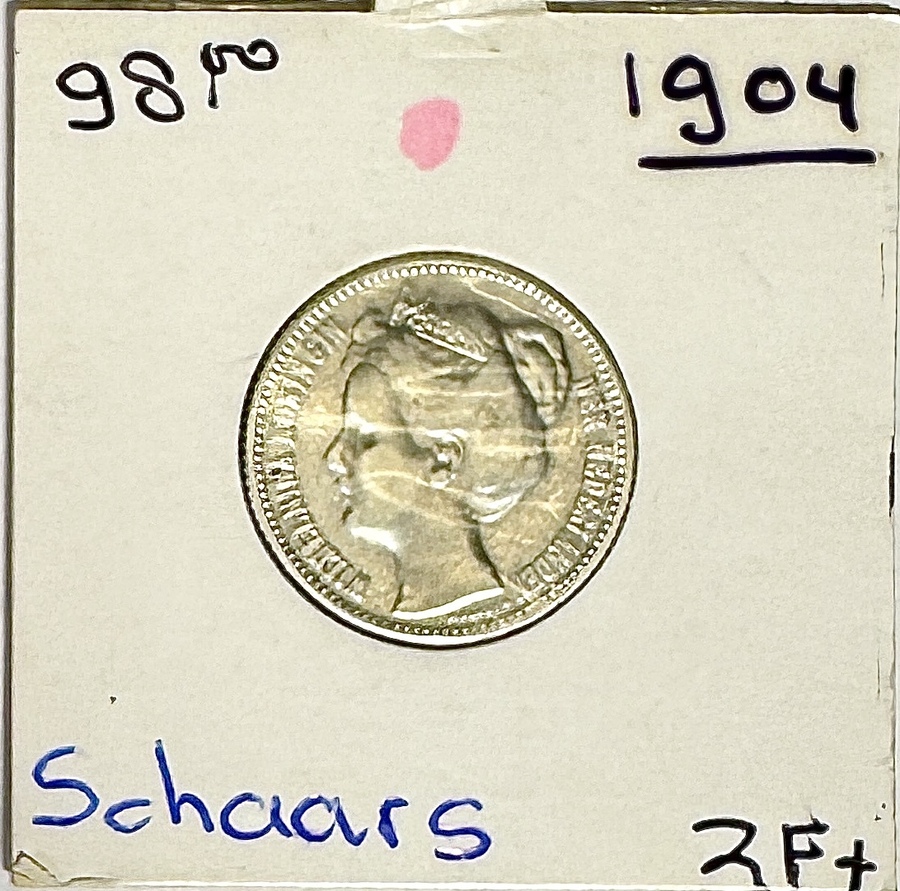 Halve gulden uit 1904, Nederland, geslagen in zilver 0,720. Voorzijde toont Koningin Wilhelmina (1880–1962) naar links met opgestoken haar, keerzijde het Nederlandse gekroonde wapen met waarde aanduiding ½ G. Geslagen bij de Rijksmunt Utrecht, gedateerd 1904.