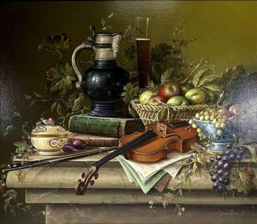 Schilderij, stilleven met viool en fruit, door Thomas F. Heesakkers (1946), olieverf op doek. Realistisch uitgevoerd stilleven met viool, fruit, porselein en boeken, gekenmerkt door verfijnde detaillering. Rechtsonder gesigneerd, 20e/21e eeuw.