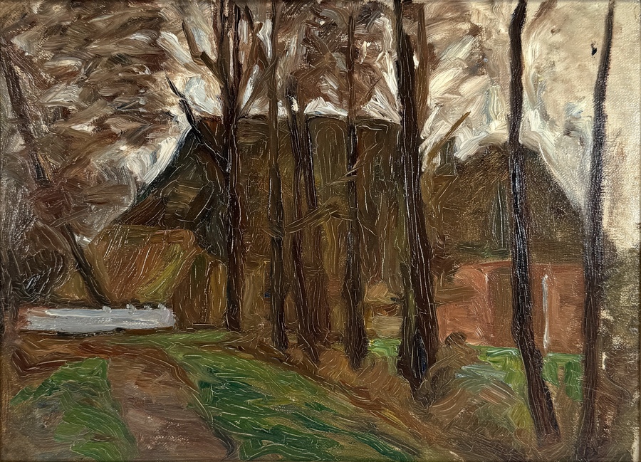 Olieverfschilderij op doek door Reinhart Dozy (1880–1947), een boomrijke compositie met los geschilderde bomen en suggestie van een boerderij. Circa eerste helft 20e eeuw, achterzijde een expositielabel Museum Vledder. Provenance: collectie zoon van de kunstschilder.