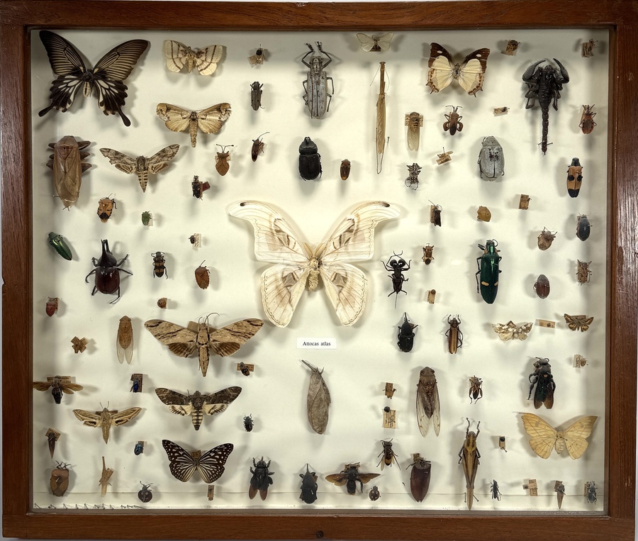 Vitrine met diverse geprepareerde insecten, eerste helft 20e eeuw, houten kast met glazen voorkant en centraal de atlasvlinder.