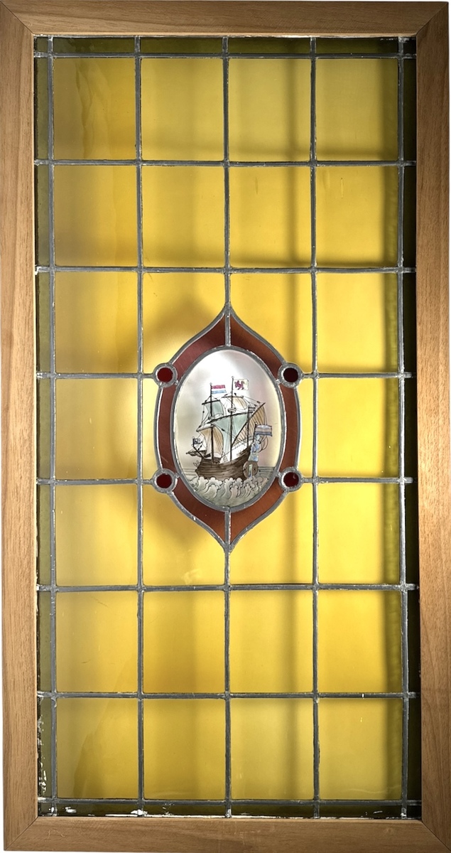Glas-in-lood raam, 20e eeuw, uitgevoerd in glas en lood met houten omlijsting. Het raam is opgebouwd uit gele rechthoekige vlakken met centraal een ovaal medaillon. In dit medaillon is de Halve Maen van de Vereenigde Oostindische Compagnie afgebeeld, onder leiding van Henry Hudson in 1609 de Hudsonbaai binnengevaren. De voorstelling combineert loodtechniek met beschilderd glas in maritieme thematiek.