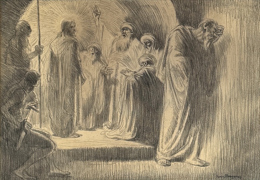 Tekening van Han van Meegeren (1889-1947), voorstellende Christus voor het Sanhedrin. Houtskool op papier, gesigneerd rechtsonder, ingelijst met passe-partout. Eerste helft 20e eeuw.