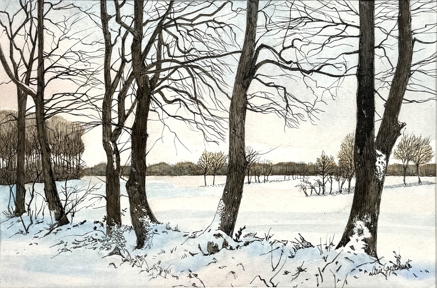 Gemengde techniek met inkt en aquarel op papier door de Hoogeveense kunstenaar Arie Goedhart (1944-2020), bekend van zijn vele hunebed tekeningen. Het werk toont een besneeuwd winterlandschap met kale bomen en een open veld, zorgvuldig opgebouwd in fijne lijnen en subtiele kleurvlakken. Ingelijst met passe-partout en verso informatie. Gesigneerd rechtsonder. De titel "Heezeberg in de Sneeuw", begin 21e eeuw.