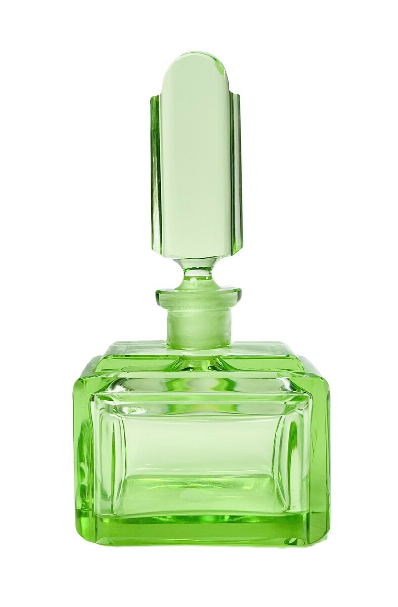 Art Deco uraniumglazen parfumflesje, circa 1920-1940, uitgevoerd in geperst en geslepen glas met opvallende geometrische vormen. Voorzien van een langwerpige gefacetteerde stop en typische fluorescerende groene kleur die oplicht onder Uv-licht. Kenmerkend voorbeeld van functioneel ontwerp met decoratieve uitstraling uit deze periode.