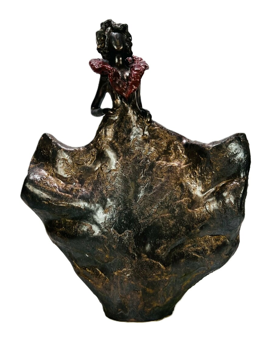Keramieken beeld van een vrouwelijke figuur. gegoten met gepolijste en ruw bewerkte oppervlakken, donker patina en roodbruine accenten. De gestileerde houding en wijd uitlopende rok geven een moderne, expressieve uitstraling. Onderaan beeld gemonogrammeerd L, tweede helft 20e eeuw.
