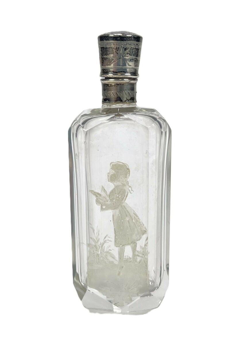Kristallen parfumflesje met Mary Gregory afbeelding en zilveren montuur, eind 19e eeuw. Handgeblazen kristal met gegraveerde florale motieven, voorzien van een zilveren schroefdop en montuur. Het bolvormige ontwerp werd gebruikt voor exclusieve geuren en verwijst naar de luxe parfumtradities van de periode. Dit functionele flesje combineert ambachtelijk vakmanschap met een kenmerkende stilistische vormgeving.