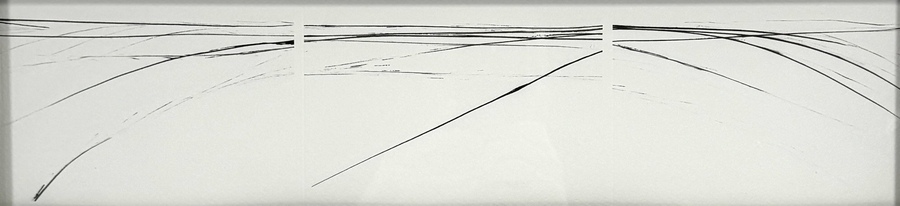 Minimalistische triptiek met dynamische, abstracte lijnstructuren, omstreeks eind 20e eeuw. Inkt op papier, ingelijst in zilverkleurig metalen frame met glas. Compositie verdeeld in drie segmenten met vloeiende horizontale en diagonale lijnen.