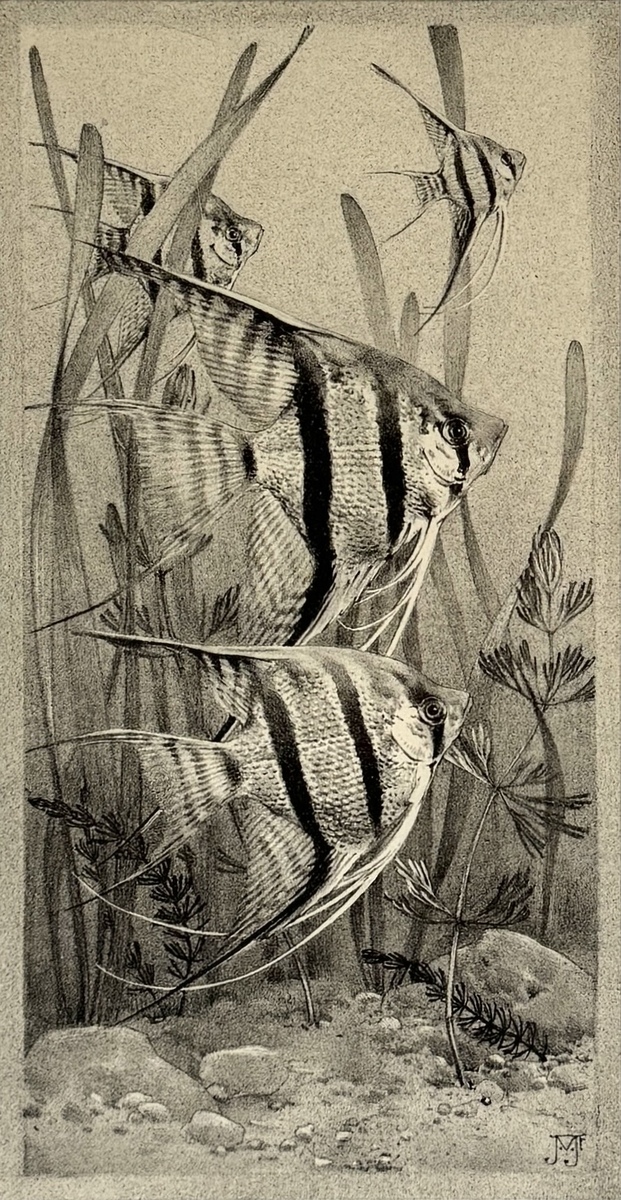 Litho op papier, midden 20e eeuw,. Naturalistische stijl met verfijnde weergave van vier maanvissen tussen waterplanten. Uitgevoerd in subtiele grijstinten met nadruk op structuur en textuur. Gesigneerd met monogram rechtsonder. Het werk is ingelijst en voorzien van een passe-partout.