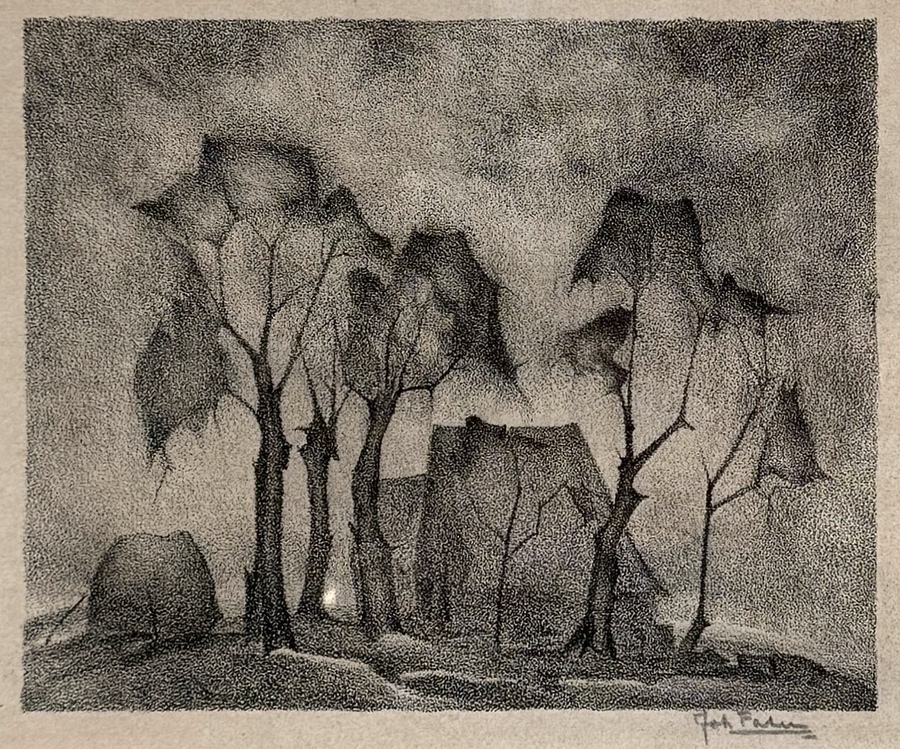 Litho van Johann Faber (1902–1979), midden 20e eeuw, uitgevoerd op papier. Voorstellend een landschap met groep bomen en een boerderij, opgebouwd uit een pointillistische benadering waarbij het beeld wordt gevormd door fijne stipstructuren. Gesigneerd rechtsonder. Ingelijst met passe-partout en zilverkleurige lijst. Het werk kenmerkt zich door subtiele licht-donker contrasten en een sfeervolle, bijna dromerige weergave van het onderwerp.