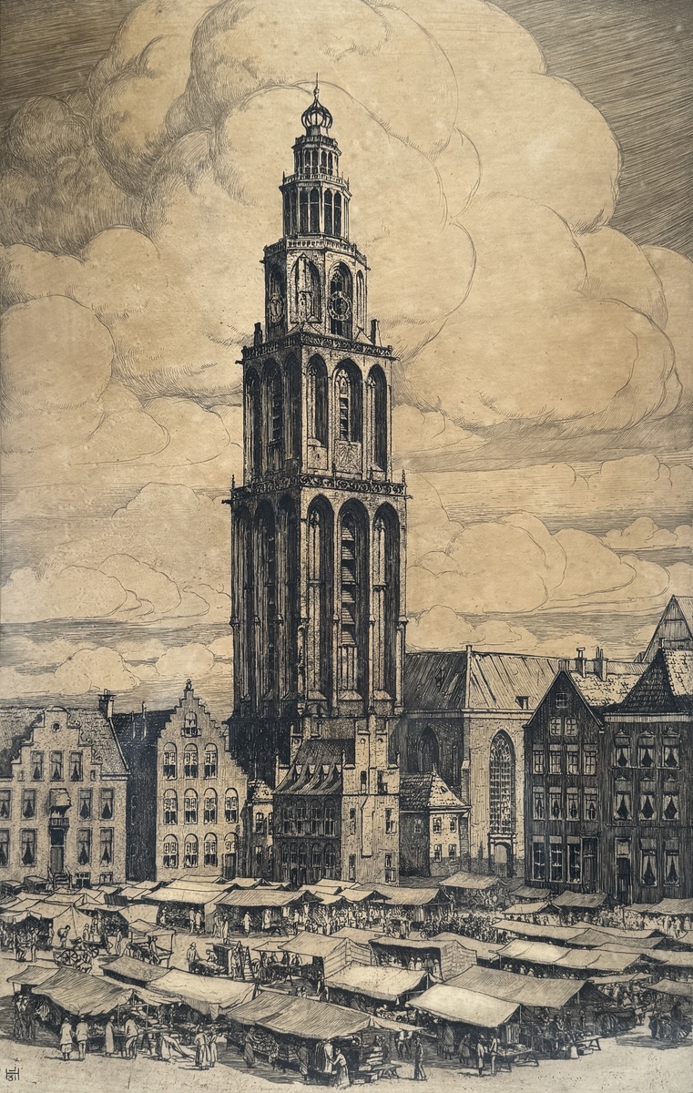 Ets van Johan Hemkes (1894 - 1988), op papier uit 1931. Realistische en gedetailleerde stijl met focus op de Martinitoren en de Grote Markt in Groningen, inclusief marktkramen en bezoekers. De lucht is rijk uitgewerkt met wolkenpartijen. Gesigneerd in potlood rechtsonder.