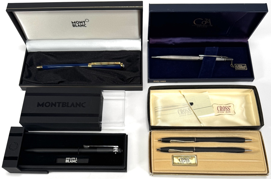Luxe schrijfinstrumenten van Montblanc, Caran d'Ache en Cross, eind 20e eeuw tot begin 21e eeuw. Metaal, kunststof en lak, uitgevoerd in diverse stijlen en kleuren. De set bevat twee Montblanc pennen, blauw met goudkleurige accenten en mat zwart, een zilverkleurige Caran d'Ache pen en een Cross set met balpen en vulpotlood. Allen in originele dozen.