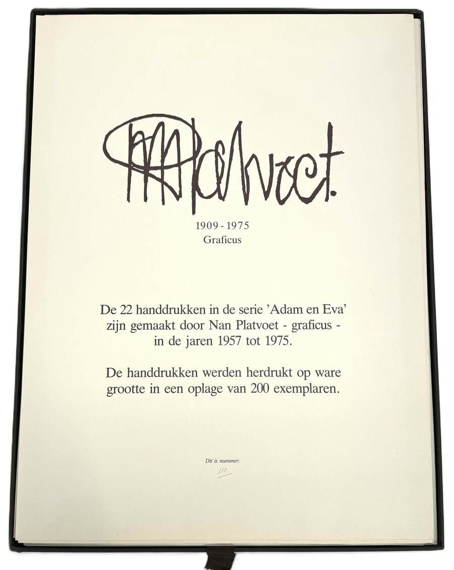 Doos bevattende de herdruk van de 22 handdrukken in de serie ‘Adam en Eva’ door graficus Nan Platvoet (1909-1975). De grafisch-figuratieve stijl bevat symbolische motieven rond het Bijbelse verhaal van Adam en Eva, met silhouetten, typografie en plantenmotieven. Oplage 200, dit is nr. 110, inclusief drie lijsten.