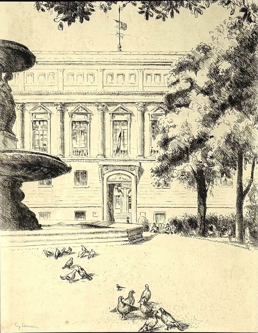 Ets van de La Bibliotheque Nationale op Canson et Montgolfier vélin-papier. Door Eugène Corneau (1894-1976). Niet genummerd, conform de editie, gesigneerd in de plaat linksonder. Uitgegeven door L'Imprimerie Daragnès Parijs, gedrukt door Jean Gabriel Daragnès, Parijs, 14 juli 1937.