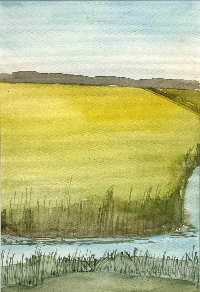 Aquarel op papier, 20e eeuw, in ingetogen moderne stijl met vlakke kleurvlakken en zachte lijnen. Afgebeeld is een glooiend geelgroen veld met waterpartij en subtiele horizonlijn onder een zachte lucht. Het werk is ingelijst achter glas in een lichte houten lijst, voorzien van een etiket van een Groninger lijstenmaker.
