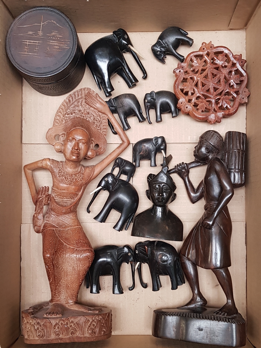 Curiosakavel, 20e eeuw, bestaande uit handgesneden houten objecten waaronder een Balinese danseres, Afrikaanse trommelspeler, diverse olifantenbeelden, een buste, ronde doos met gegraveerd landschap en opengewerkte onderzetter. Traditionele stijl, uitgevoerd in tropisch hout, met etnografische en decoratieve accenten.