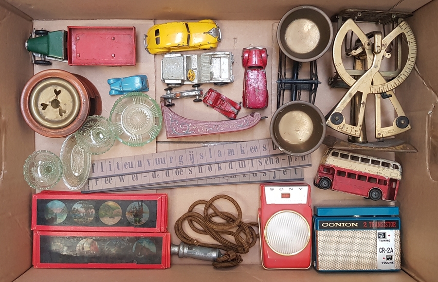 Curiosakavel, 20e eeuw, samengesteld uit diverse metalen. Bestaande uit kunststof miniatuurvoertuigen, glazen schaaltjes, messing weegschaal, toverlantaarnplaatjes in dozen, sjabloon, touw met haak en transistor radio’s.