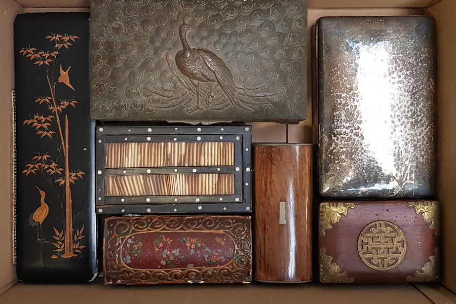 Curiosakavel, 20e eeuw, bestaande uit zeven doosjes in hout, metaal, lakwerk en combinatiematerialen, met Aziatische en Europese invloeden. Inclusief doos met pauwdecor in reliëf, lakdoos met kraanvogels, ingelegde houten doos met longevity-symbool en polychroom beschilderde doos.