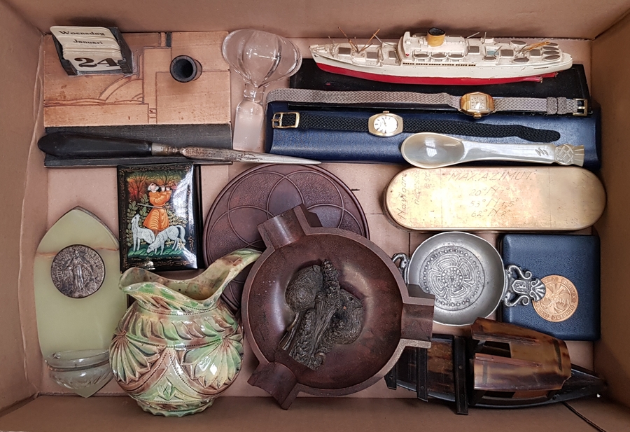 Lot curiosa samengesteld uit diverse objecten in metaal, keramiek, glas, kunststof en hout. Bestaande uit nautische schaalmodellen, religieuze plaquette, Russisch lakkistje, asbak met vogelmotief, keramische kan, penningen, horloges, glazen zandloper en schrijfgerei. 20e eeuw.