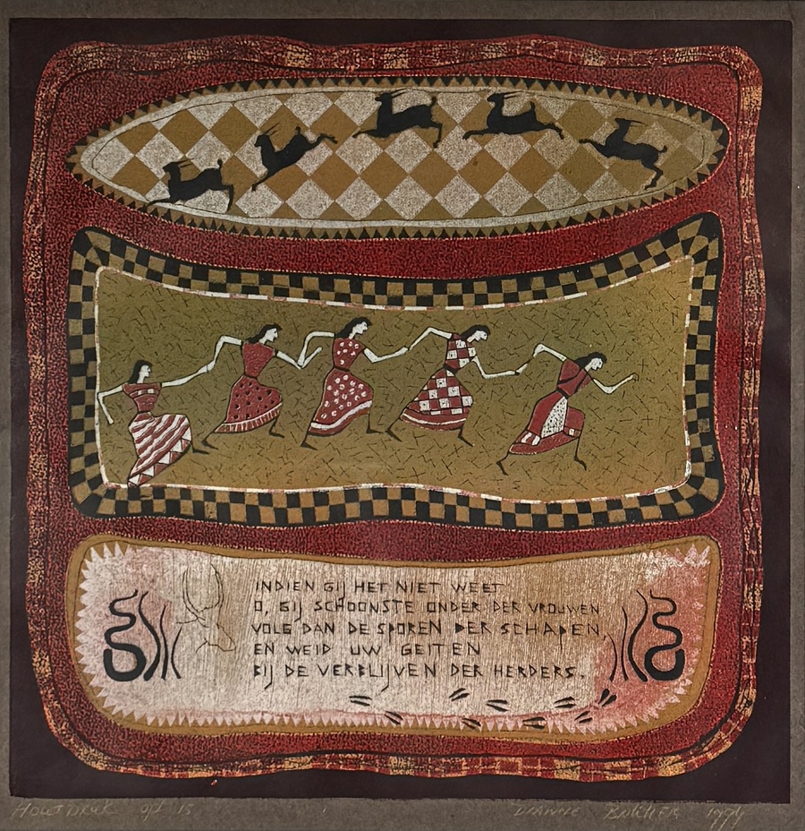 Houtdruk van Dianne Bakker (1958), gedateerd 1994, op papier, figuratieve en decoratieve stijl met zes dansende vrouwen in folkloristische jurken, dierenmotieven en een Nederlandstalige bijbeltekst. Onderaan met potlood getiteld, gesigneerd, gedateerd en oplagenummer 9/15. Gekenmerkt door ornamentale kaders, warme aardetinten en een verhalend-poëtisch karakter, geplaatst in zwart passe-partout en lijst.