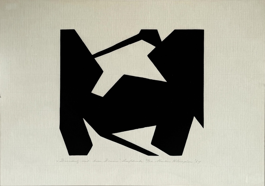 Zeefdruk van Marten Klompien (1917–1996) getiteld "Boerderij met twee bomen", datering 1967, uitgevoerd op papier in abstract-geometrische stijl. Het werk toont een gestileerde voorstelling van een boerderij met twee bomen, opgebouwd uit contrasterende zwarte vlakken. Onderaan met potlood getiteld, gesigneerd, gedateerd en oplagenummer 39/50.