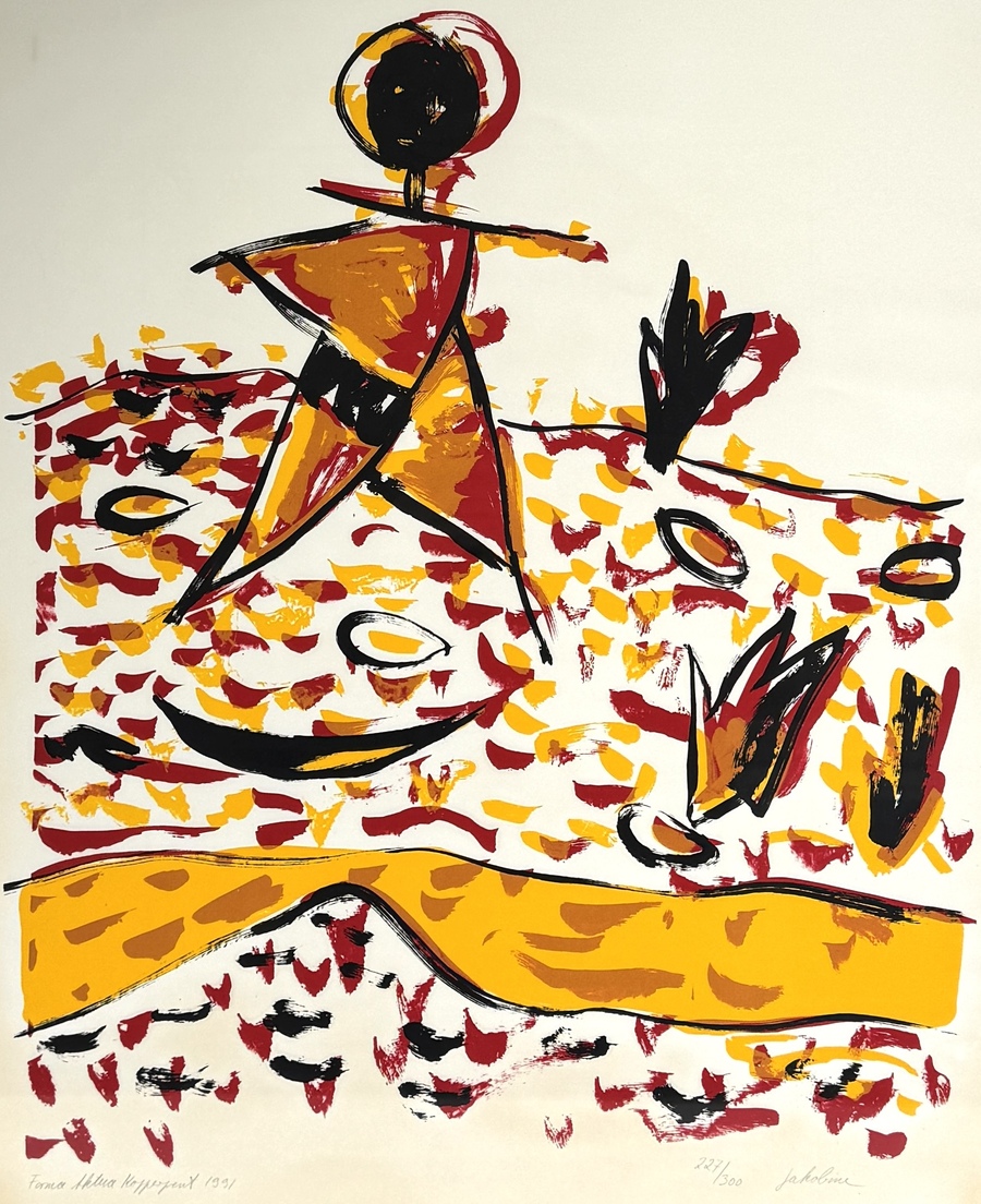 Koppermaandag prent van Jacobine van Dömmingen (geboren 1959), datering 1991, op papier, in expressieve abstract-figuratieve stijl met felrode, gele en zwarte accenten en centraal geometrisch figuur. Onderaan met potlood "Forma Aktua Kopperprint 1991", gesigneerd en oplagenummer 227/300.
