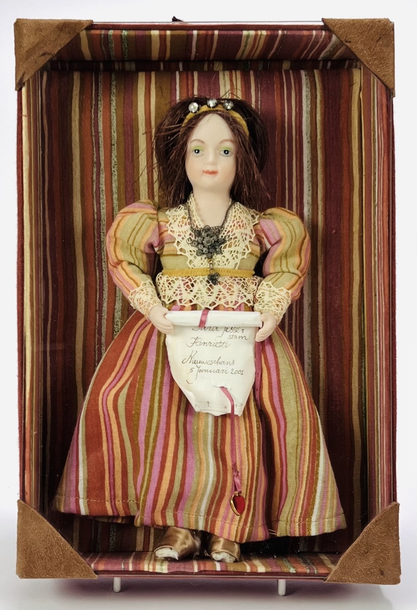 Pop in doos van Arts Sanders, begin 21e eeuw, vervaardigd uit textiel, porselein, glas en karton. Handgemaakt en beschilderd, gekleed in gestreepte historische jurk met kant en sierketting, voorzien van handgeschreven tekst "Sara Jesse’s Stam Henriëtte Nieuweschans 5 januari 2001". De pop wordt gepresenteerd in een met stof beklede doos met lederen hoekbeschermers.