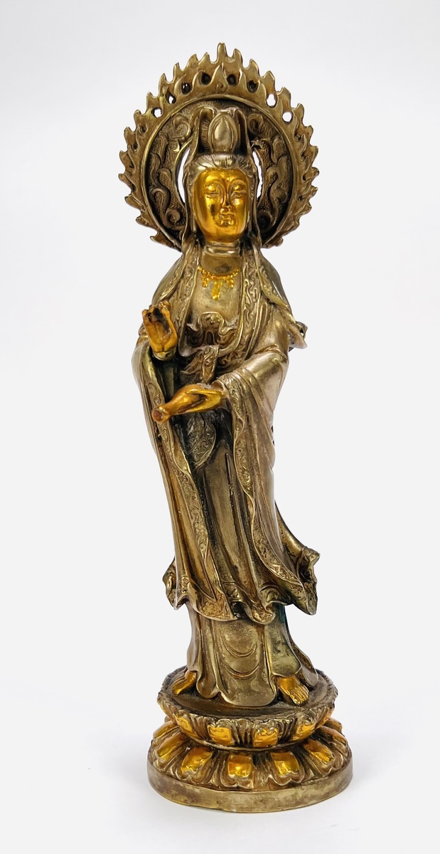 Bronzen boeddhistische beeld, eind 19e eeuw, vervaardigd in traditioneel oosters-boeddhistisch stijlbeeld. Gegoten en gegraveerd met staande figuur op lotusbasis, stralenkrans en sierlijke gewaadversieringen. Vergulde handen en gelaat benadrukken spirituele betekenis. De houding verwijst naar compassie en bescherming, typisch voor Guanyin- of Avalokiteshvara-voorstellingen in Oost-Aziatische kunst.