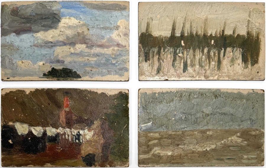 Reinhart Dozy (1880–1947), eerste helft 20e eeuw, olieverf op schilders karton, romantisch-realistische stijl. Vier kleine studies met impressionistische toets: wolkenlucht, bomenrij met reflecties, erf met wasgoed en een mistig landschap. Niet gesigneerd. Deze miniaturen illustreren de spontane plein air-benadering en aandacht voor licht en sfeer, kenmerkend voor Dozy’s werk in deze periode.