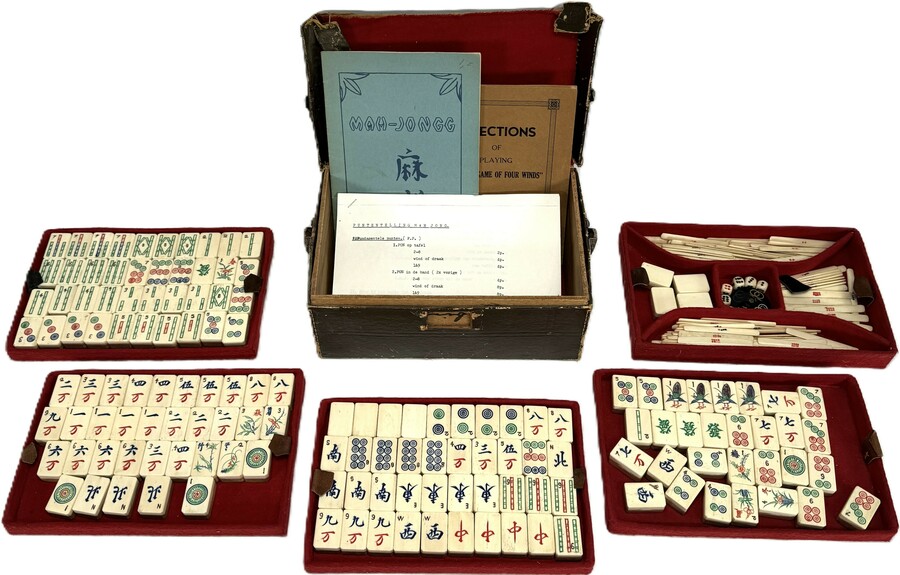 Mahjong omstreeks 1930, bestaande uit handgesneden been- en bamboetegels, houten en kartonnen doos met rode textielvoering. Compleet met fiches, dobbelstenen en handleidingen in Nederlands en Engels. Traditionele gravures in meerkleurig decor met karakters en bloemmotieven. Inclusief meerdere inzetbakken en originele sluiting.
