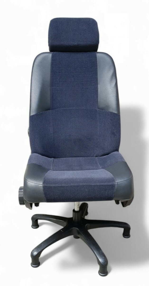 Volvo stoel, eind 20e eeuw, samengesteld uit een originele Volvo autostoel met donkerblauwe textiel- en kunstleren bekleding, gemonteerd op een zwart kunststof vijfpoot onderstel. De stoel heeft verstelbare rughoek, hoofdsteun en zithoogte, met zichtbare mechanische knoppen.